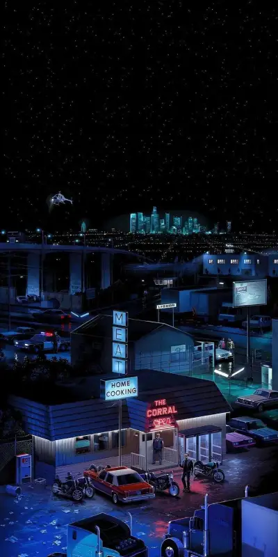 two cars parked in front of a gas station at night with the moon shining on the horizon