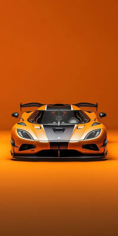 an orange and white sports car is shown in front of an orange background with the hood down