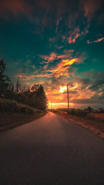 the sun is setting on an empty highway in the middle of nowhere, with cars driving down it