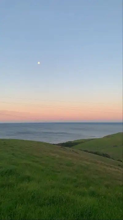 the moon is setting over the ocean with waves coming in to shore and grass on the beach