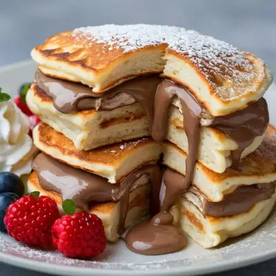 Fluffy Pancakes Decorated with Nutella 🍫🥞 Light, fluffy pancakes topped with a drizzle of rich Nutella—perfect for breakfast or dessert! 📌 Prep Time: 10 min | ⏳ Cook Time: 15 min | 🍽️ Servings: 4 ________________________________________ 📝 Ingredients For