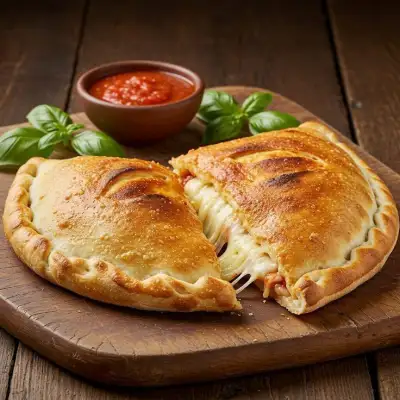 two pieces of pizza on a cutting board with sauce in the bowl and basil sprig