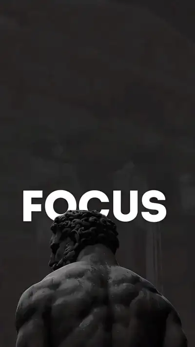 a black and white photo with the words focus on it's side, in front of a statue